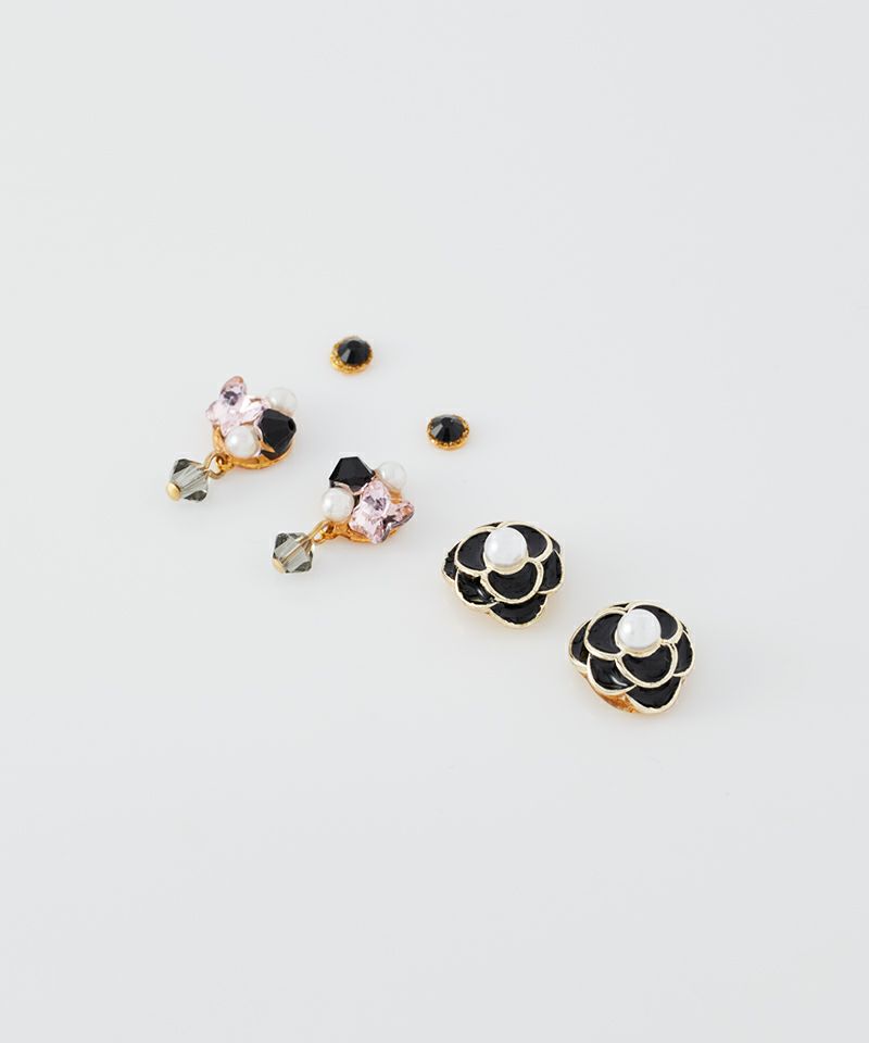 黒を基調としたクラシックフラワーピアスとビジューチャームピアスの3点セット☆