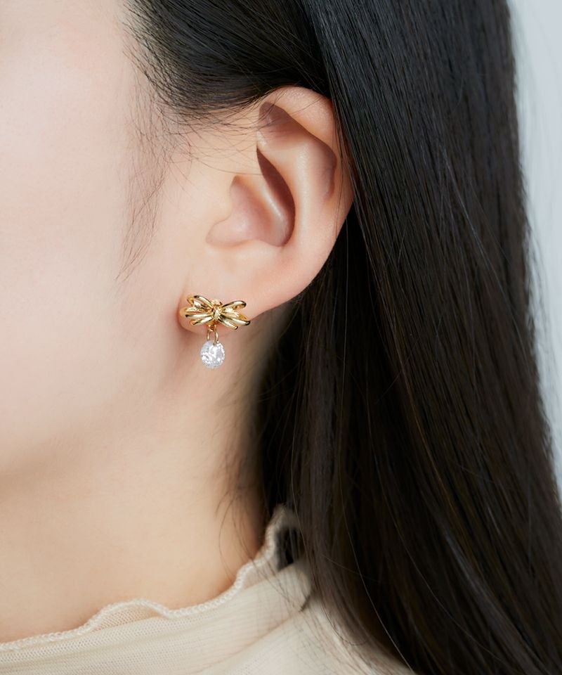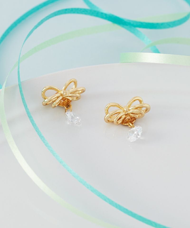 結んだリボンの下で、雫のようなキュービックジルコニアがそっと揺れる愛らしいデザイン。