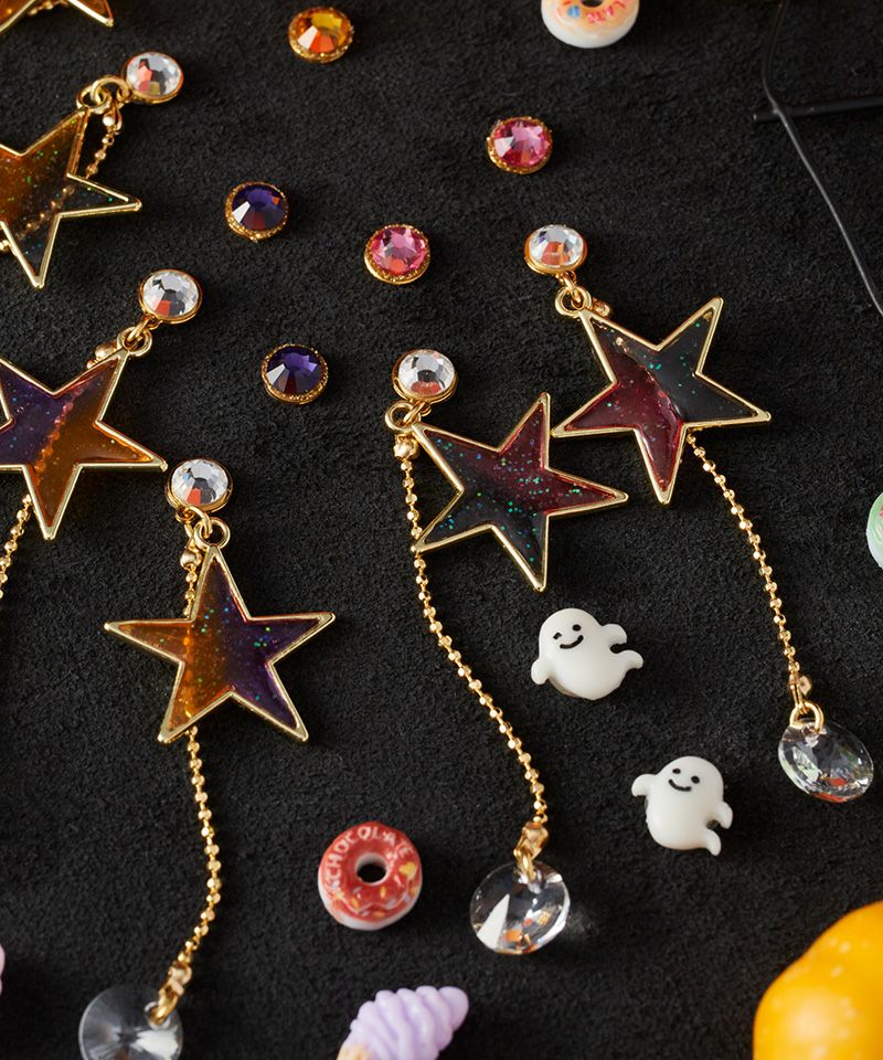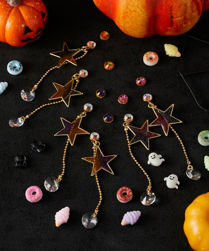 星モチーフのハロウィンカラーチャームと、おばけや黒猫などハロウィンモチーフのワンポイントピアス&PiPPiが入った充実のハロウィンアイテムセット♪
