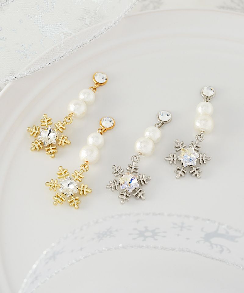 雪の結晶モチーフとパールが耳元で揺れる、冬らしい可愛いピアス☆