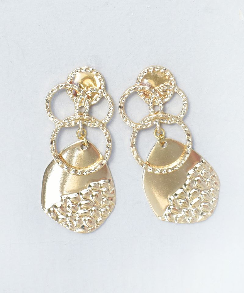 大きさの異なるリングと、クラッシュしたプレートが重なり合った完成度の高いピアス。デザイン性の高いイチオシのメタルアイテムです^^