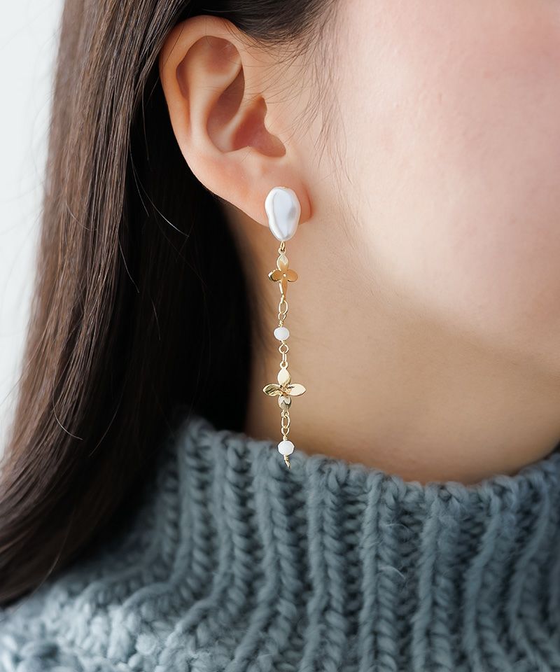 ニュアンスパールのトップに連なったメタルフラワーが存在感のあるアイテム!