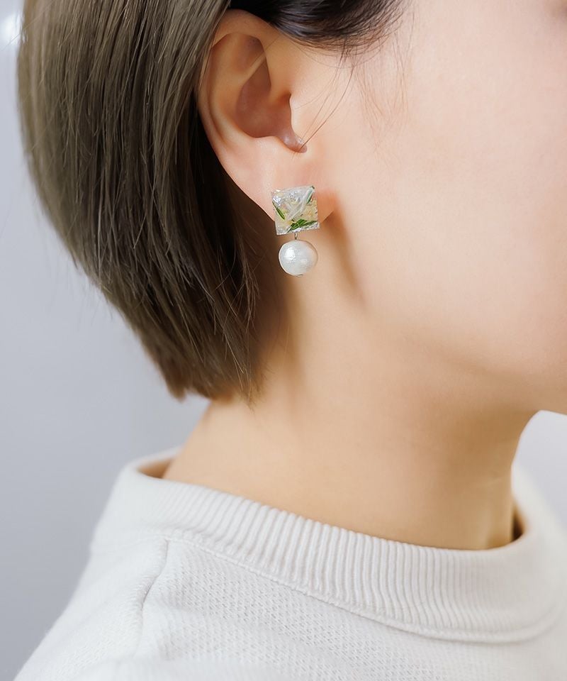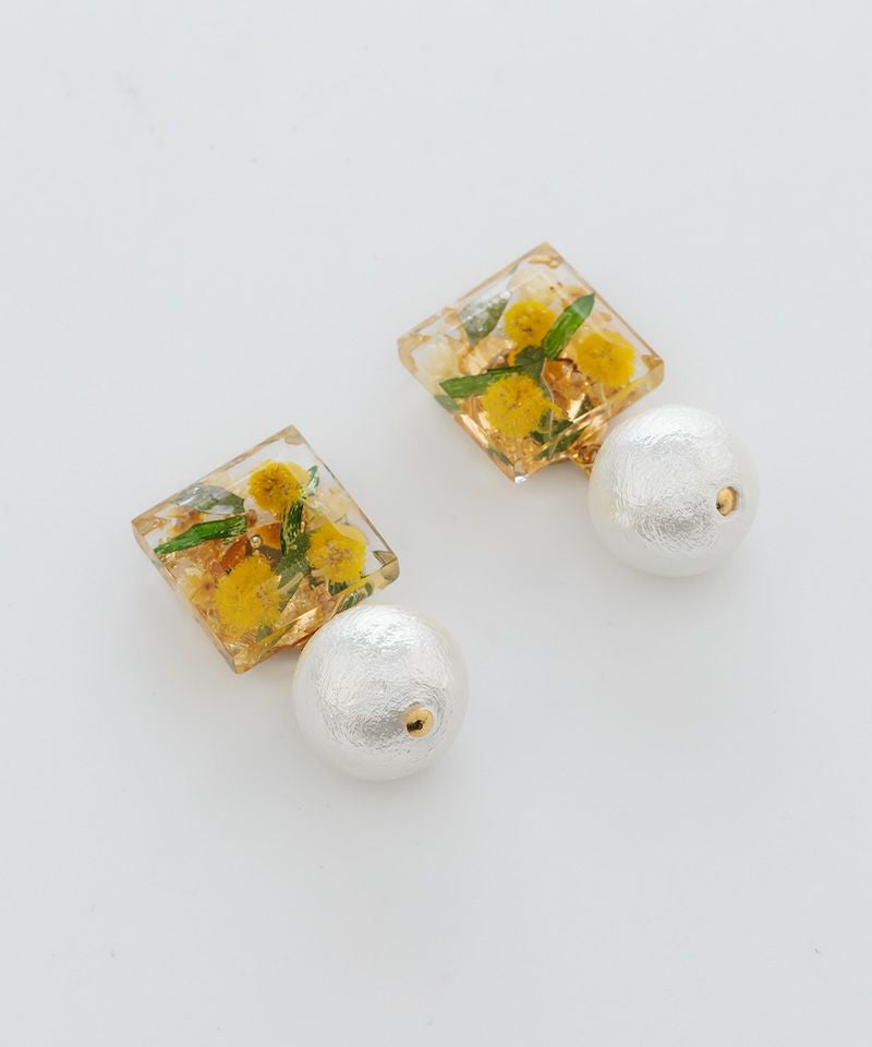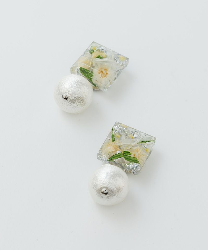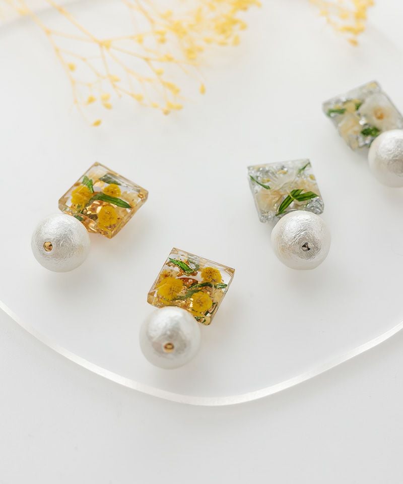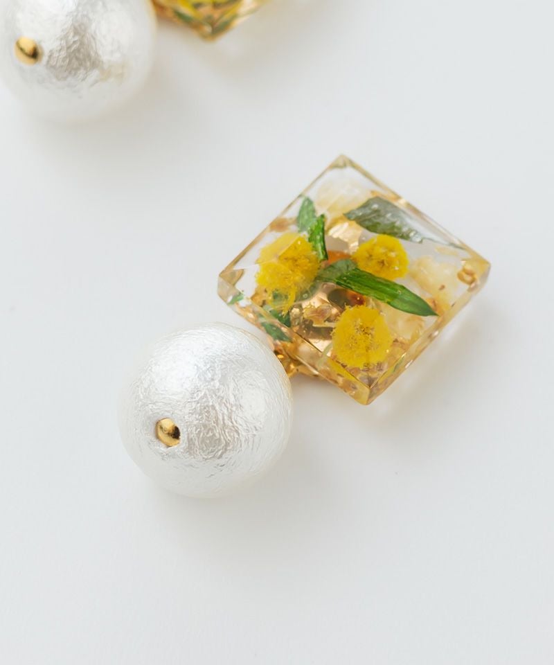 スクエアにコットンパールが揺れるコンパクトなフォルムが目を引くアイテム!