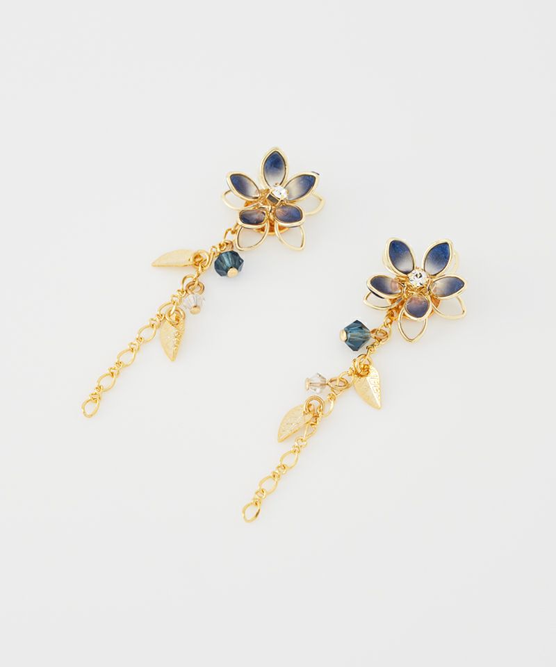淡いカラーの花びらが耳元を華やかに彩り、繊細なゴールドチェーンが動くたびに上品なきらめきを添えます。