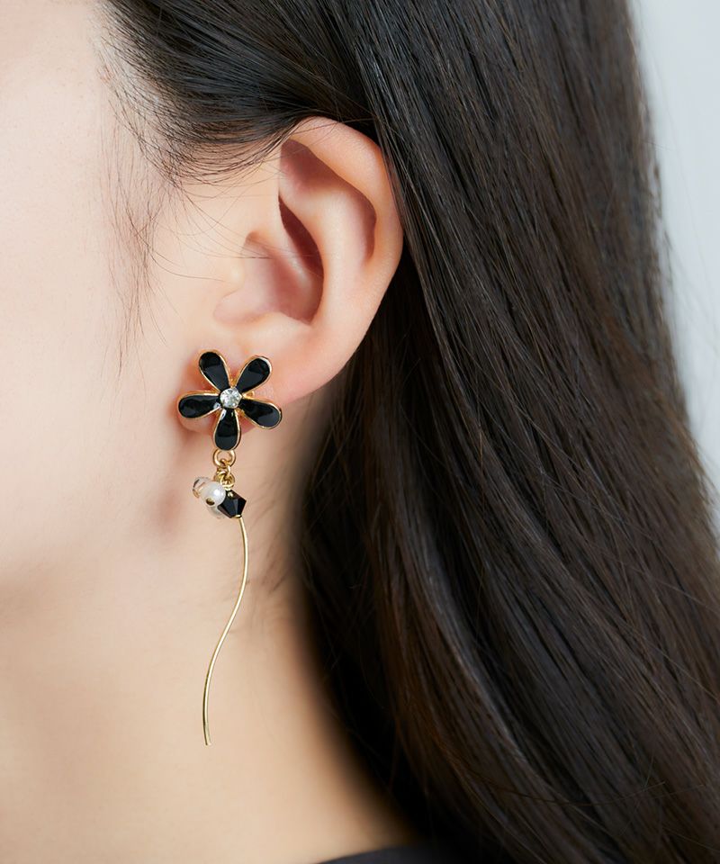 黒い花モチーフの下でS字ワイヤーが軽やかに揺れるエレガントなピアス。