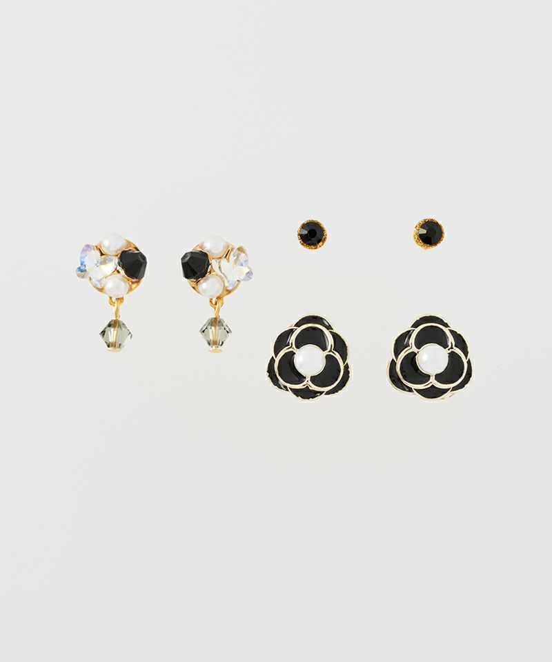 黒を基調としたクラシックフラワーピアスとビジューチャームピアスの3点セット☆