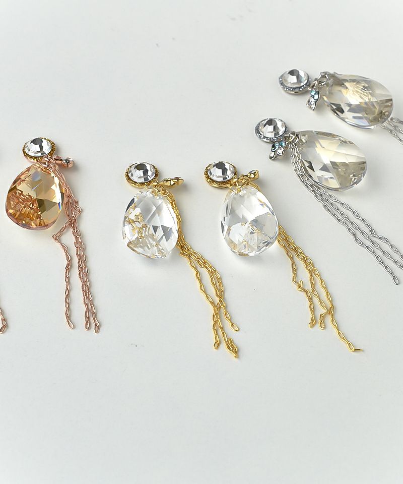大粒のスワロフスキーが、めちゃくちゃ綺麗で華奢なチェーンが揺れてとても素敵なピアスです。 豪華なピアスなので、シンプルな服装に合わせると凄く素敵に映えます。