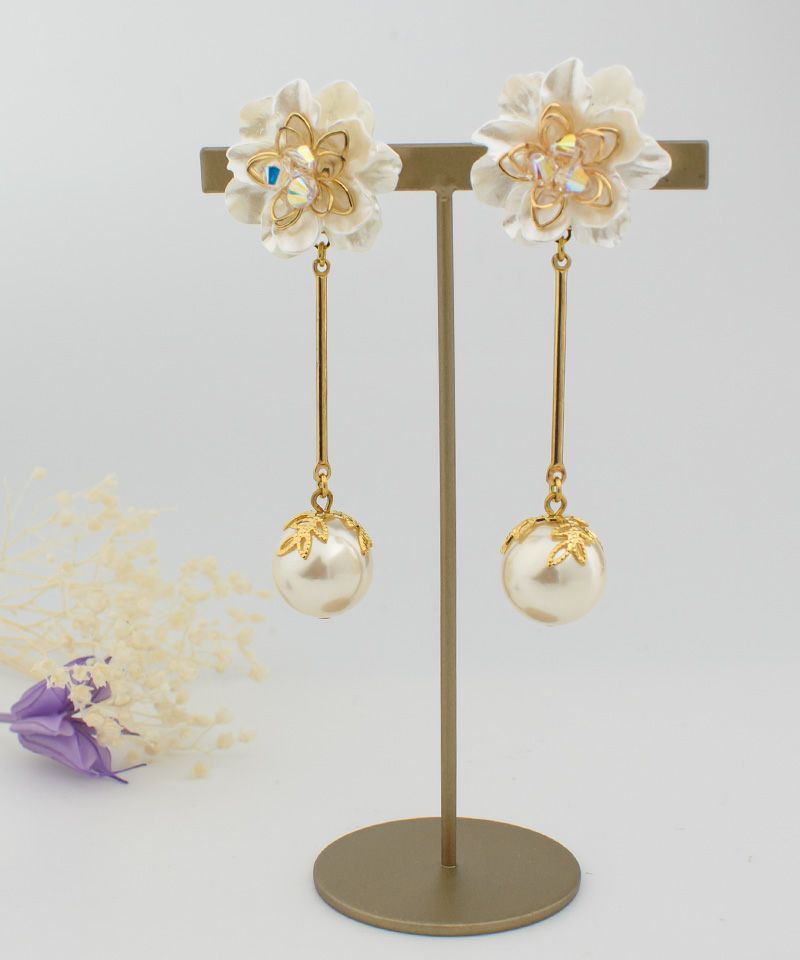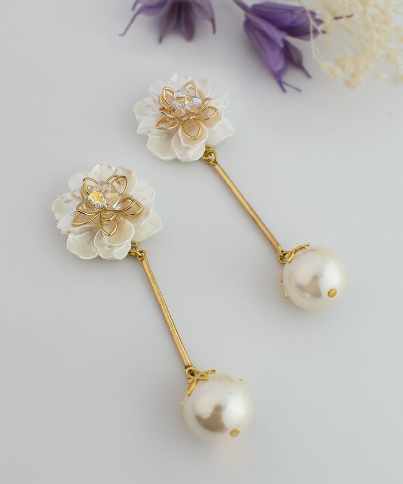 つや感のあるフラワーとパールが揺れて上品な耳元にしてくれます♪
