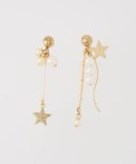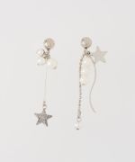 アシンメトリーに配置されたチェーンやワイヤーが流れるような輝きを演出し、それぞれパールやメタルビーズがまるで星のように輝きます。