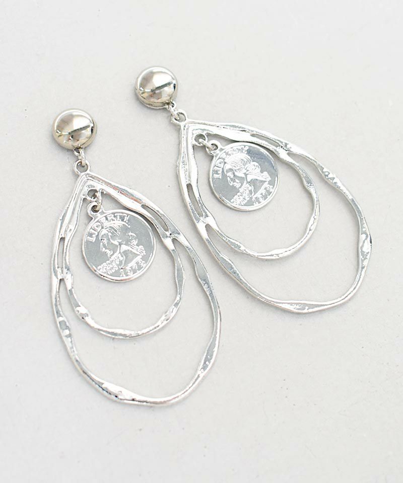 プチメダルがワンポイントのドロップ型フープ。コロンと揺れるメダルで可愛らしさをミックス。Tシャツにデニムのようなカジュアルなお洋服にも、アクセントを加えてれます!