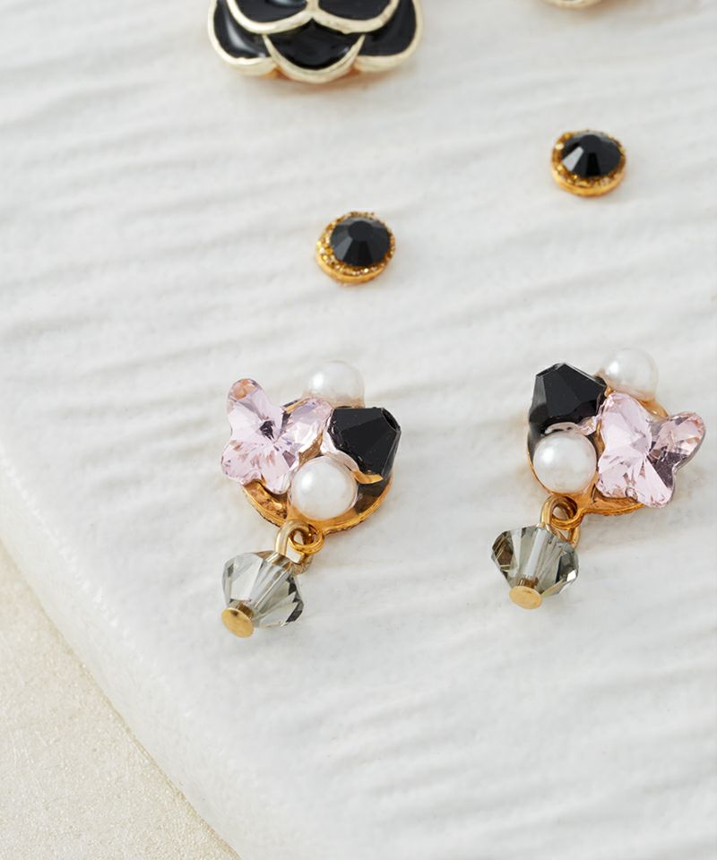 黒を基調としたクラシックフラワーピアスとビジューチャームピアスの3点セット☆