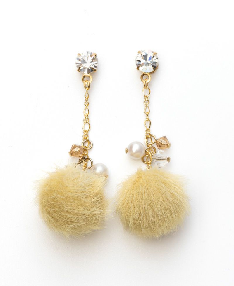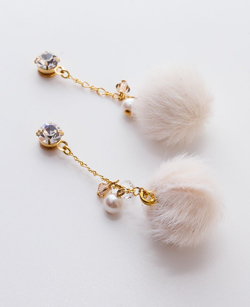 小ぶりなファーがコロンとしていてカワイイ素敵なピアスです♪ 今秋流行カラーのブラウンコーデに活躍してくれそうです♪ 長めのチェーンについているパールビジューが揺れ動く感じもとても華やかです!