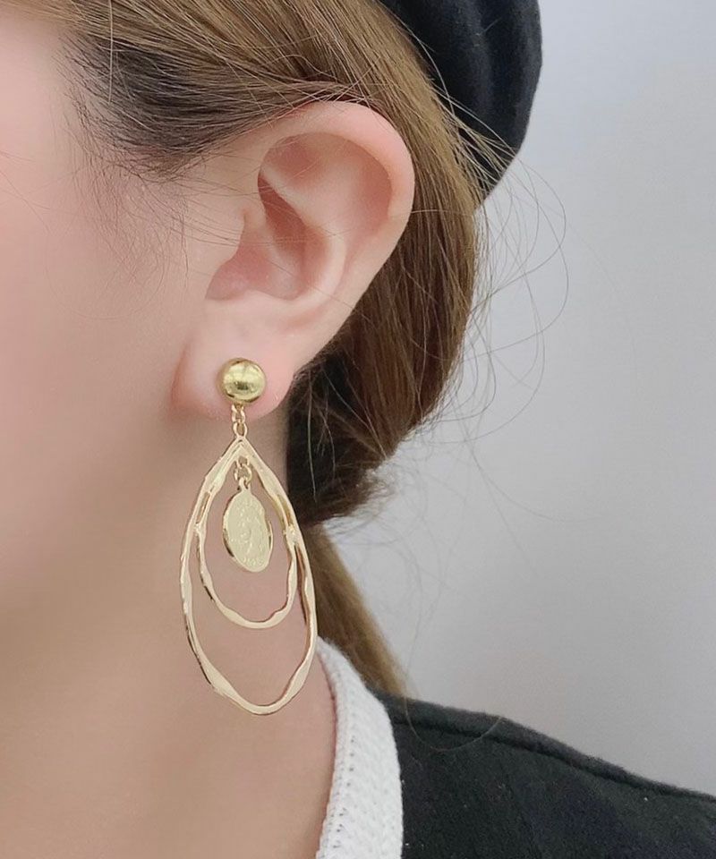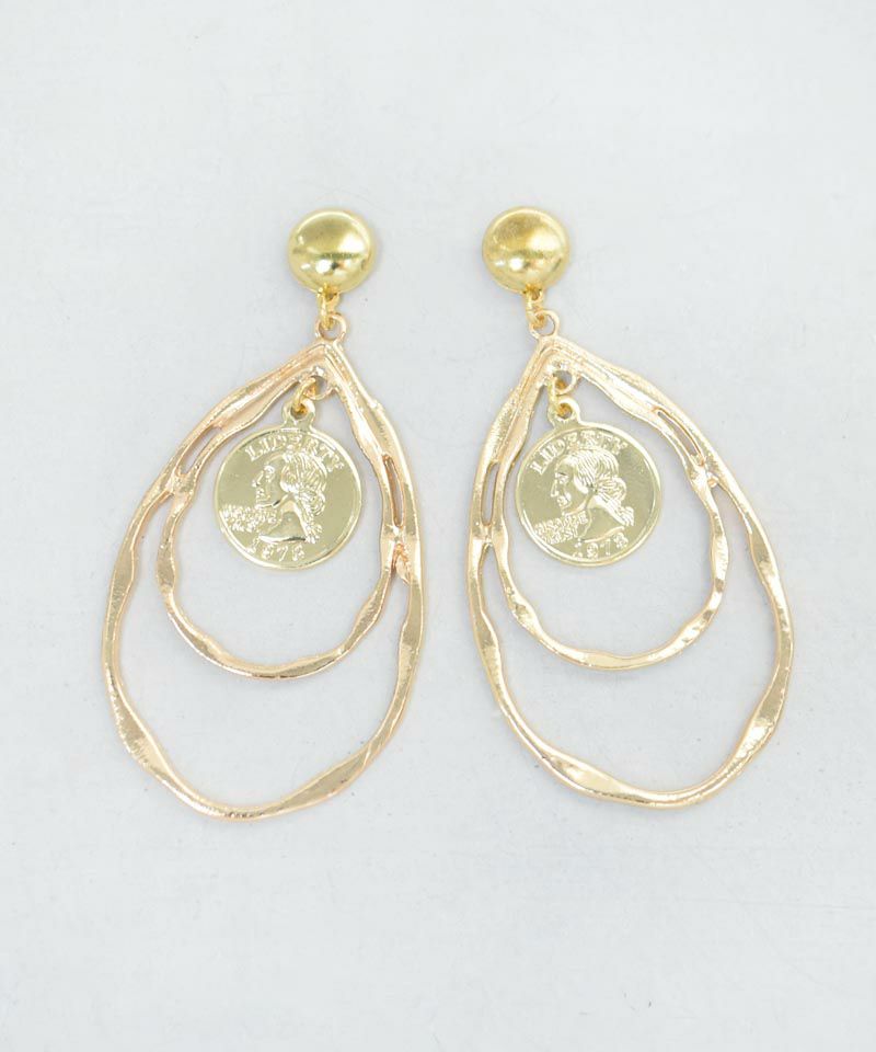 プチメダルがワンポイントのドロップ型フープ。コロンと揺れるメダルで可愛らしさをミックス。Tシャツにデニムのようなカジュアルなお洋服にも、アクセントを加えてれます!