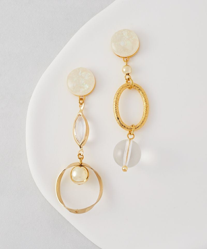 やわらかなホワイトとクリア素材が織りなす上品な揺れ感と透明感を楽しめるアシンメトリーデザイン。