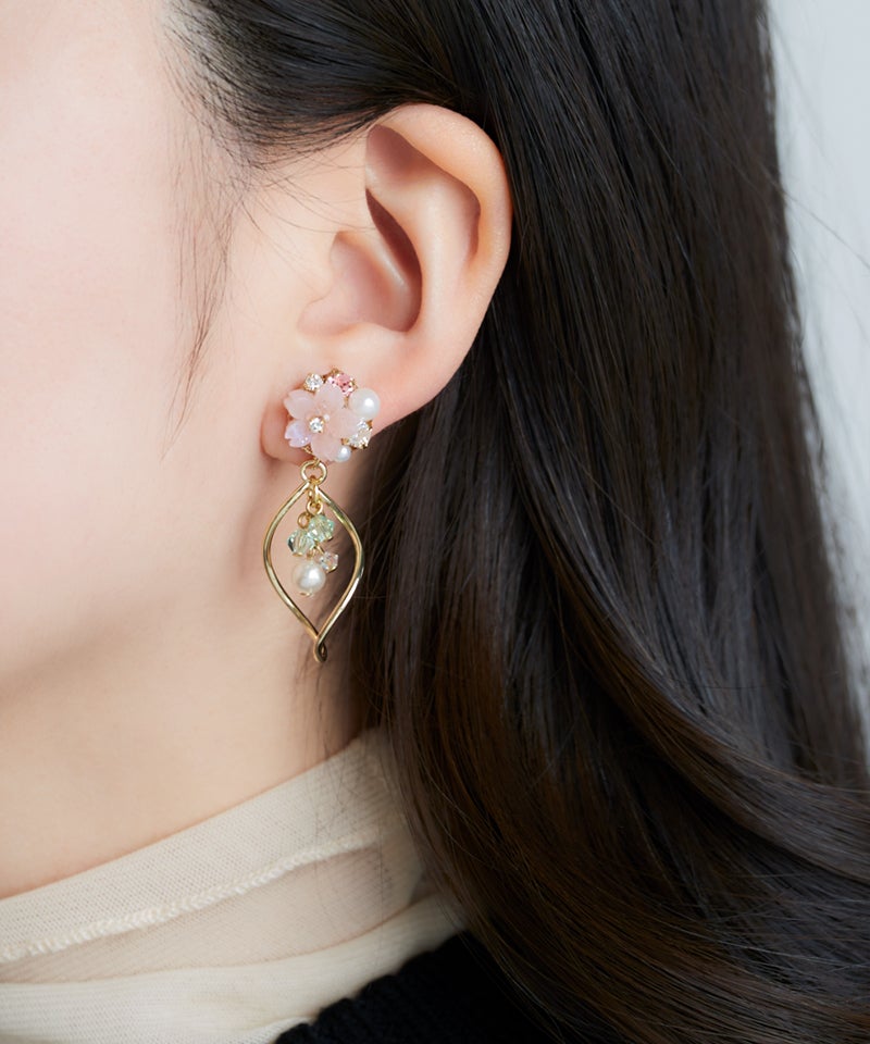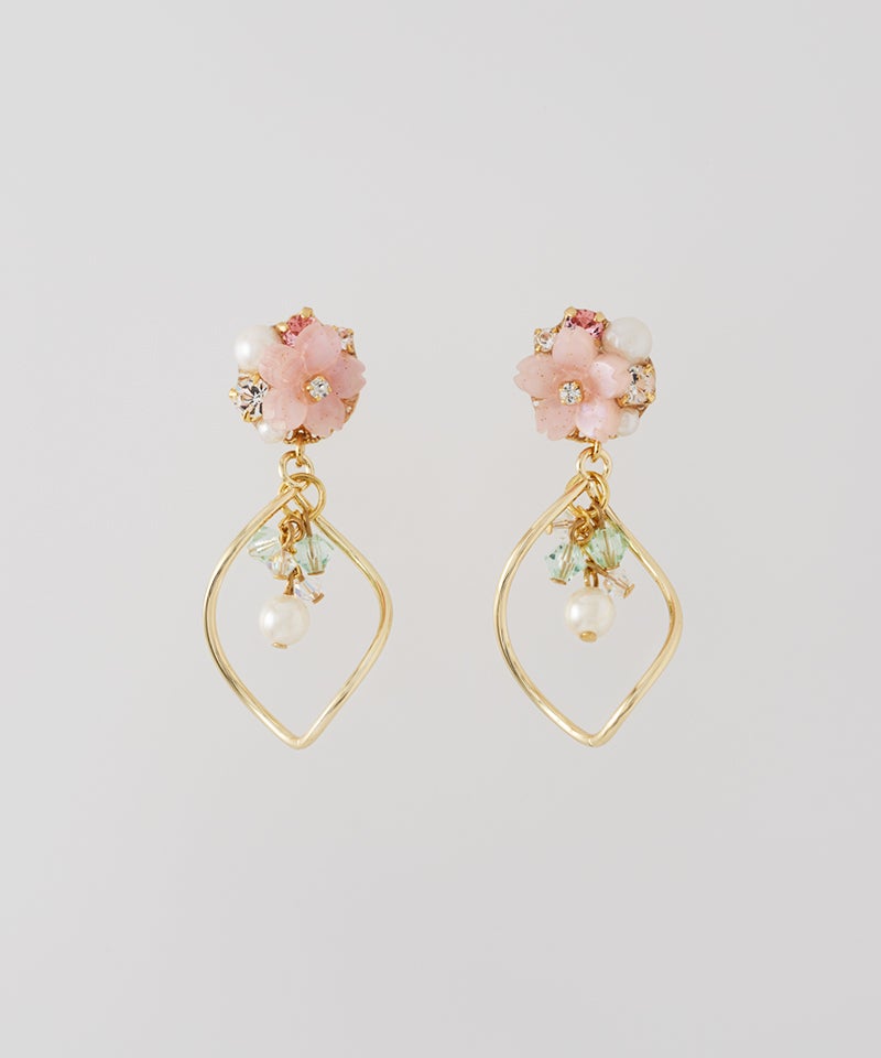 可憐な桜色のフラワーモチーフに、揺れるビジューとパールを組み合わせた華やかなアイテム♪