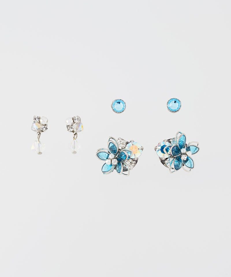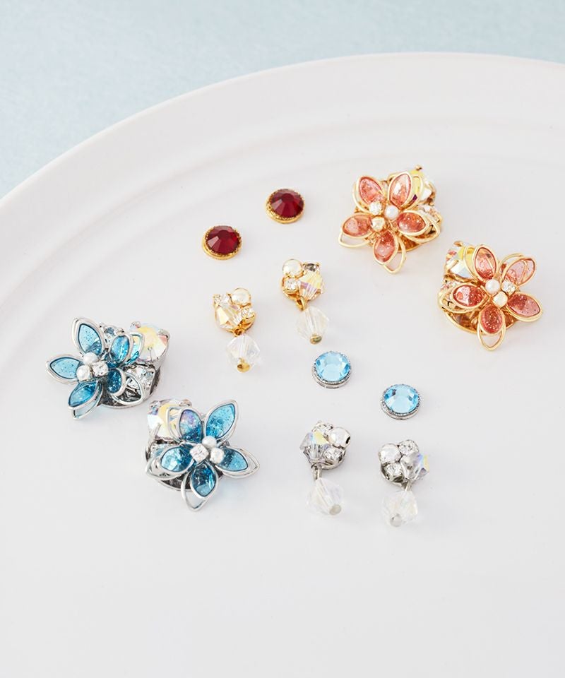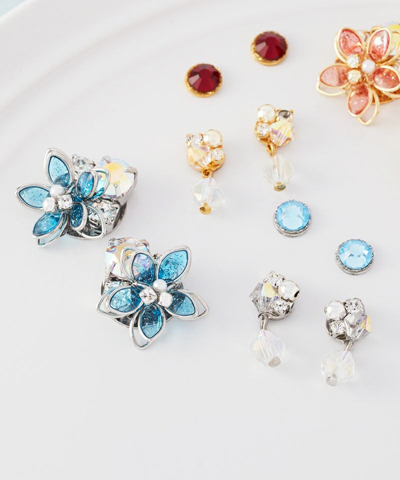 きらめくカラフルなお花のビジューと涼しげなクリアチャームの組み合わせで季節を問わずお楽しみいただけます。