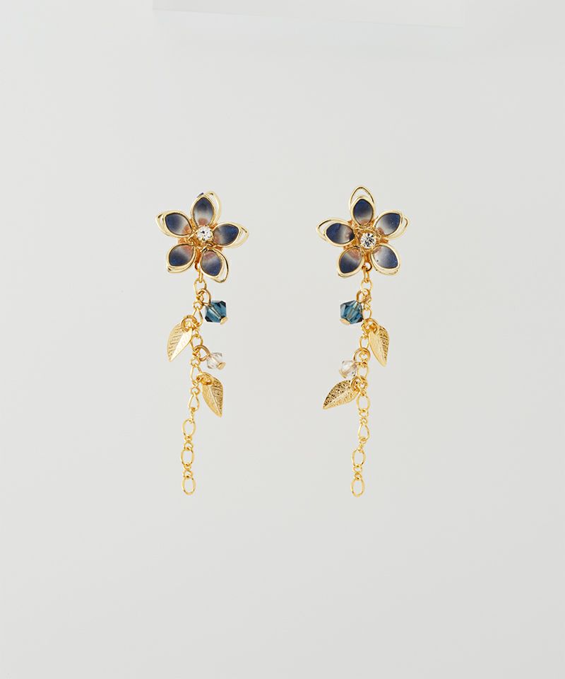 花びらの中心に輝くストーンと、可憐に揺れるリーフモチーフが印象的なアイテム。