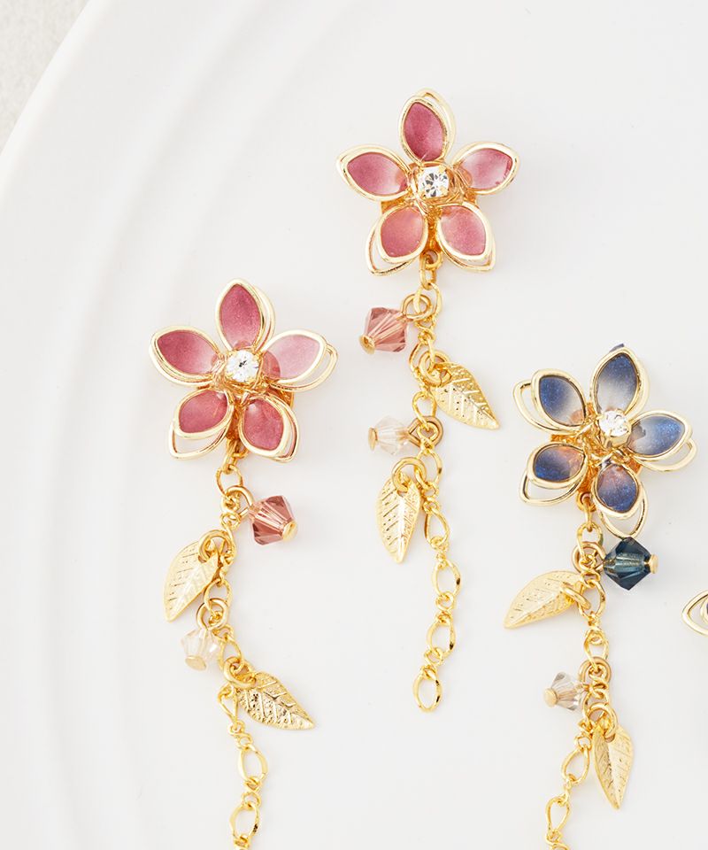 淡いカラーの花びらが耳元を華やかに彩り、繊細なゴールドチェーンが動くたびに上品なきらめきを添えます。