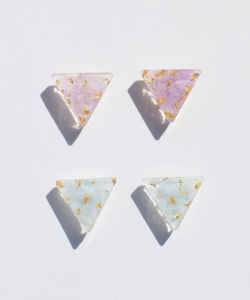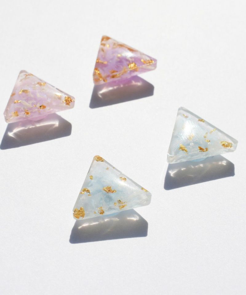 ブルーを購入しました。 ペールトーンの水色に金と白の模様が重なっていて、初夏につけたい可愛い雰囲気です。 三角形は一辺1.7cmくらい、透明のプレートでした。