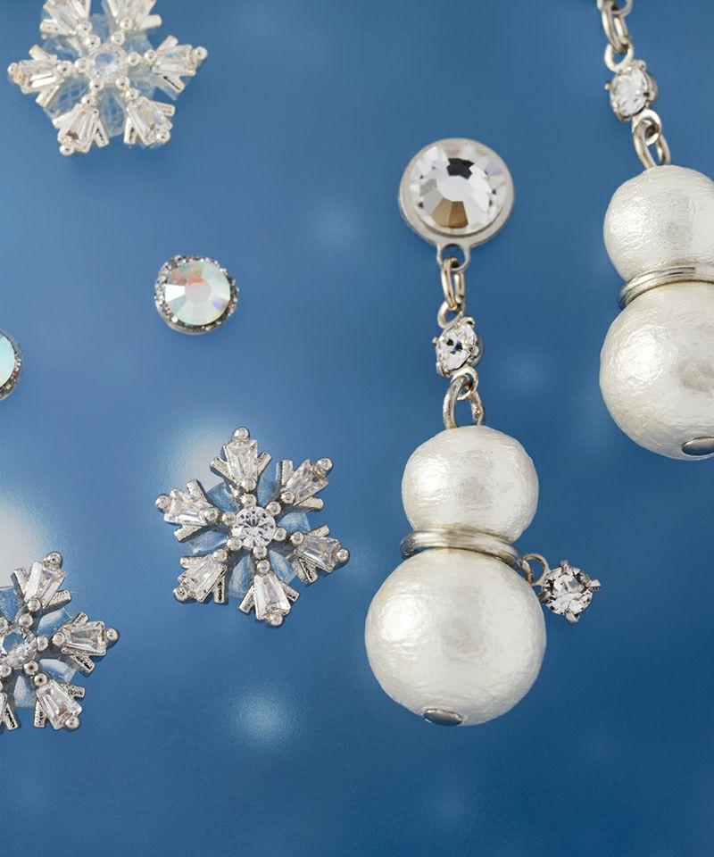 コットンパールの雪だるまチャームと繊細にきらめく雪の結晶ピアスを組み合わせた、冬感満載の3点セット♪