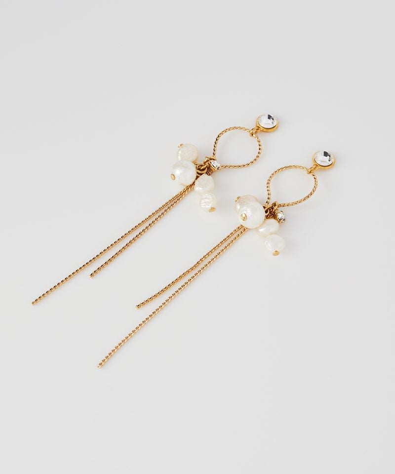 繊細なチェーンとパールが揺れ動き、耳元に華やぎを添えるエレガントなデザイン