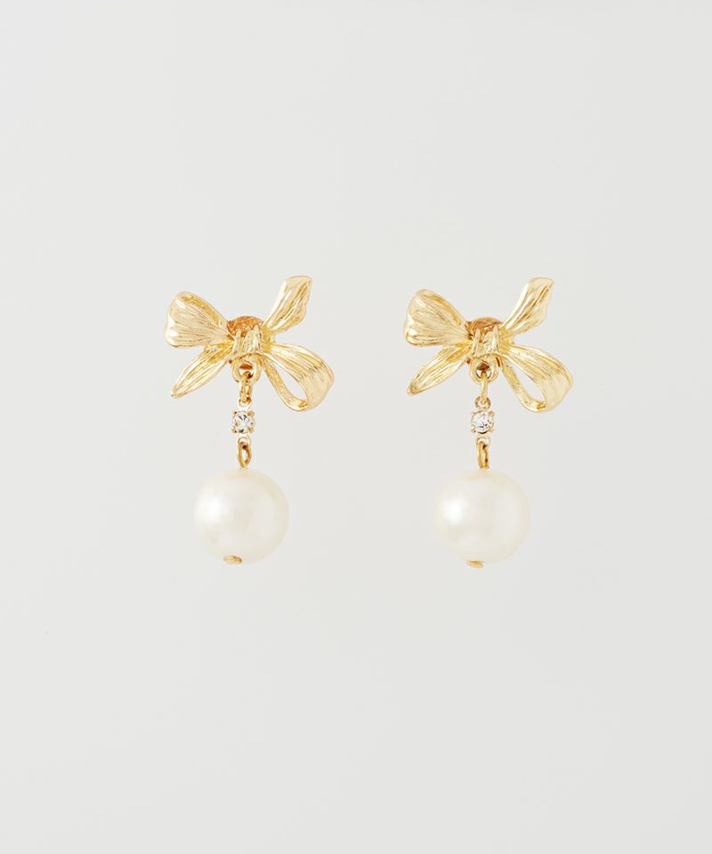 アンティーク調のメタルリボンに、パールが揺れる愛らしいデザイン。