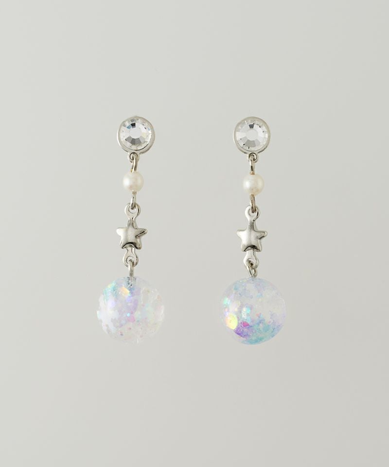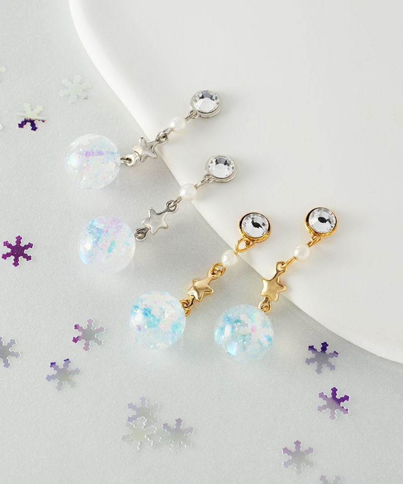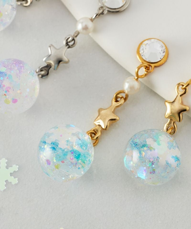 透明なボールの中で雪の結晶とラメが輝く、まるで小さなスノードームのようなアイテム!