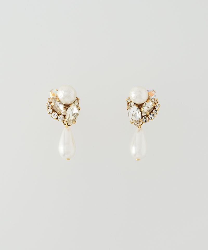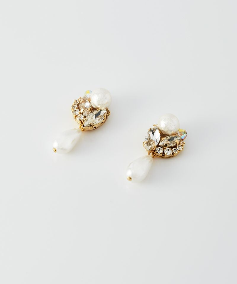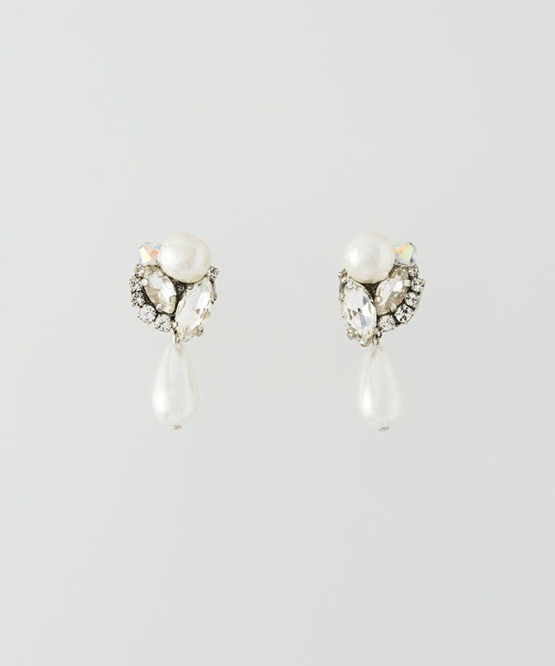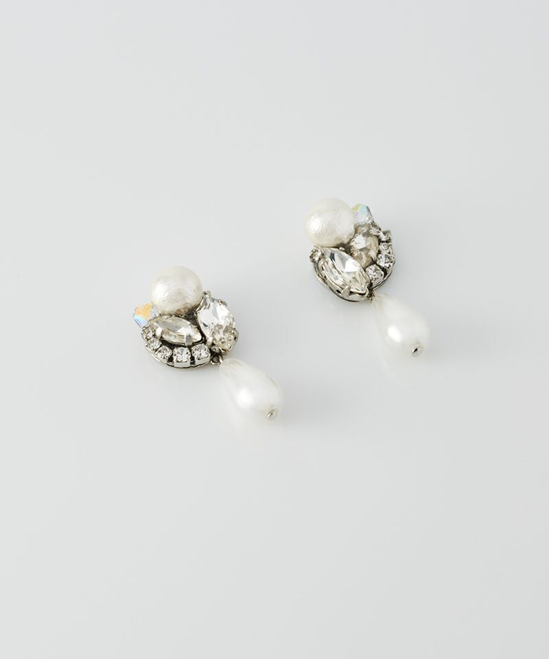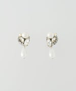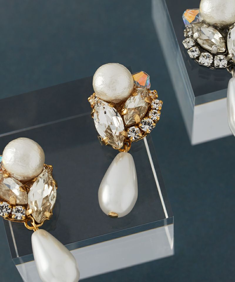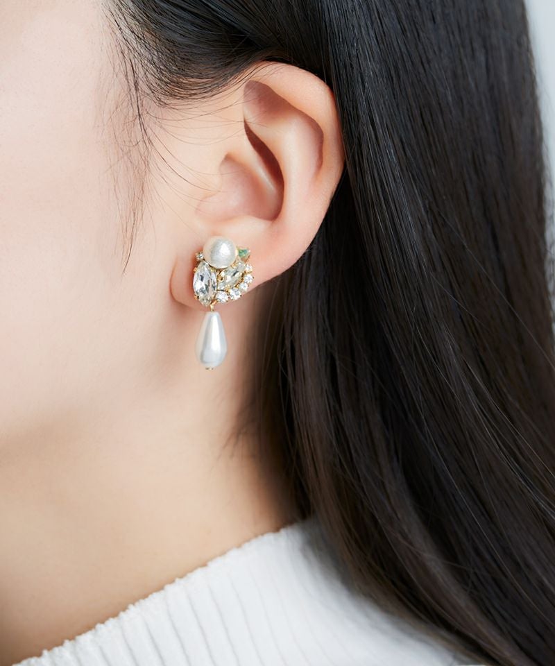 パールとクリスタルのビジューが上品な輝きを放ち、その下でドロップ型パールが揺れる、洗練されたデザイン。