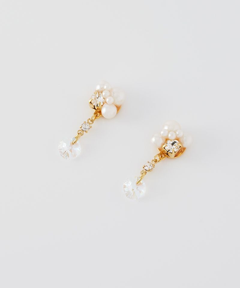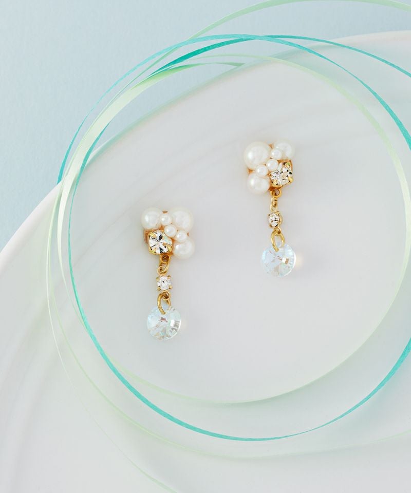 小粒パールのクラスターデザインが耳元に立体感を与え、揺れるクリスタルビジューが光を受けて繊細にきらめきます。