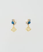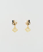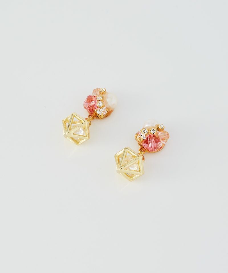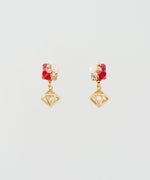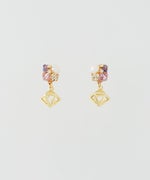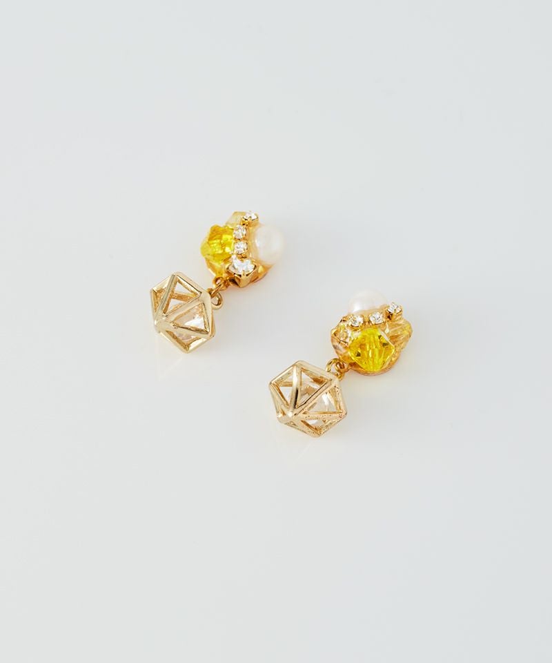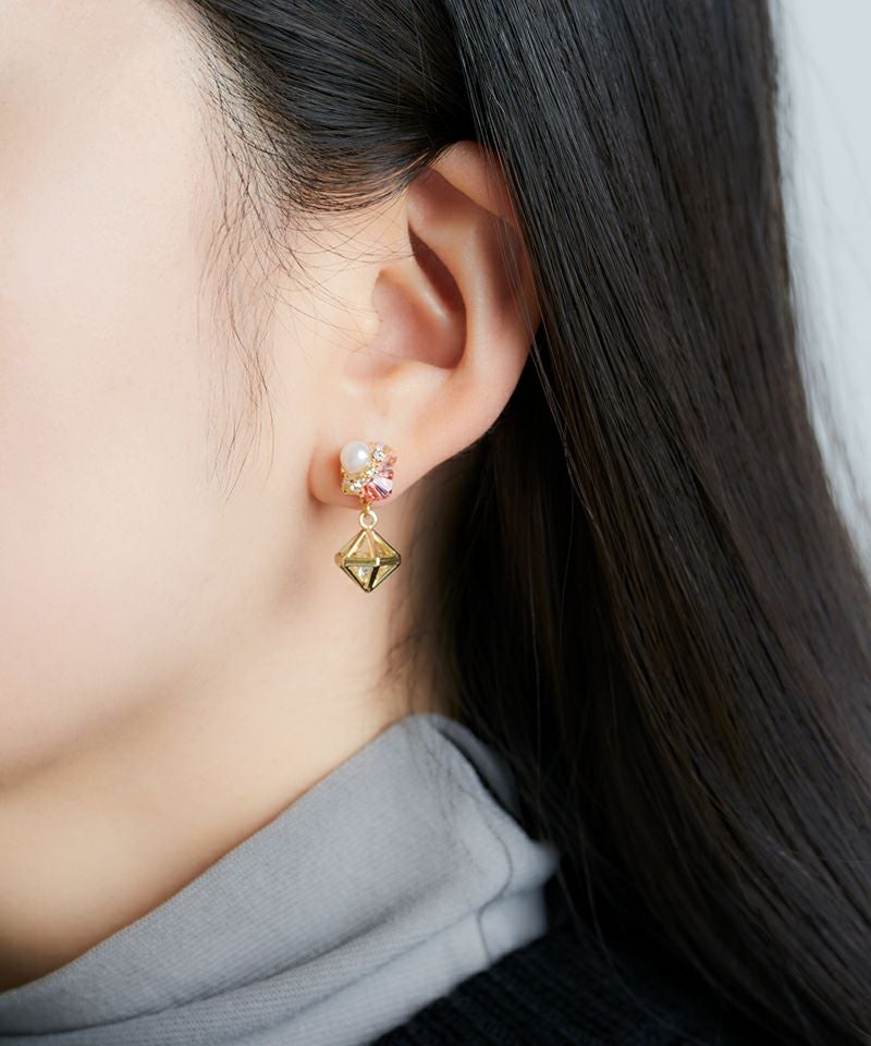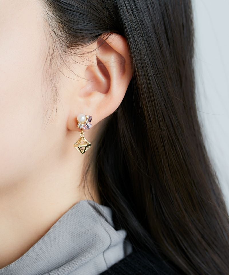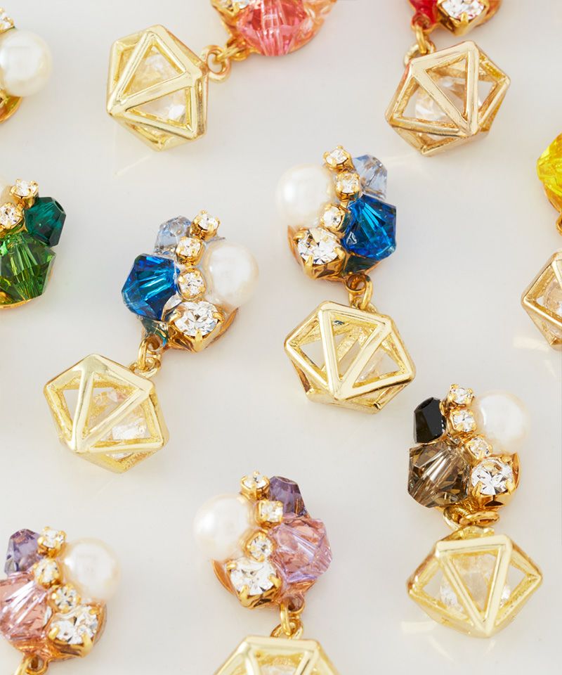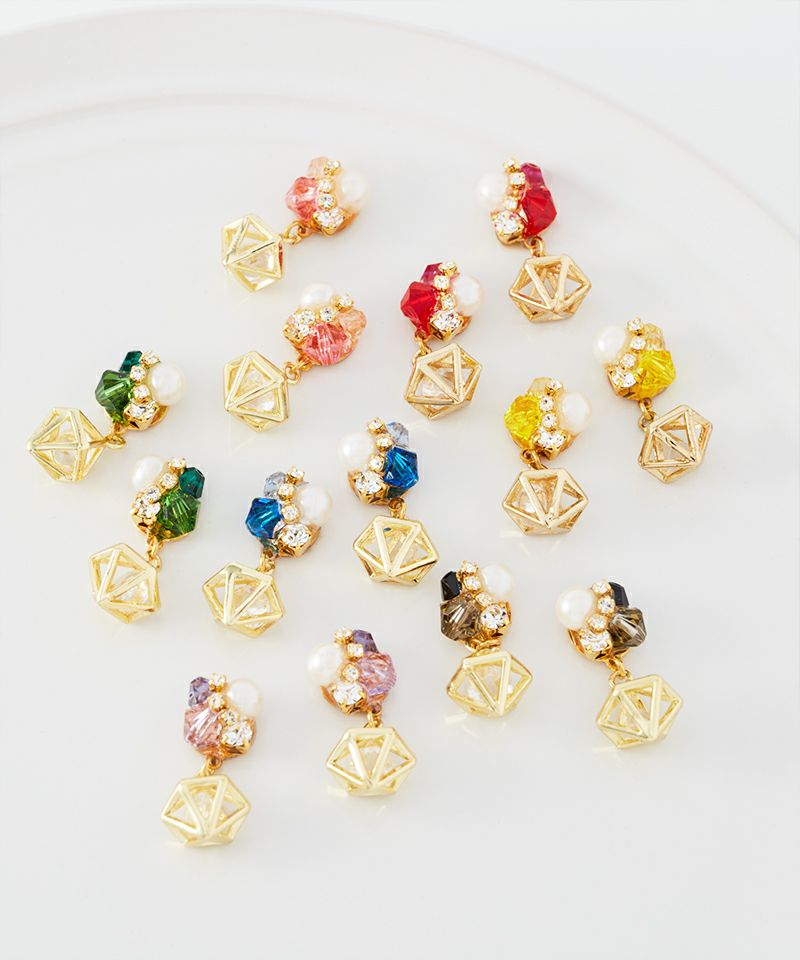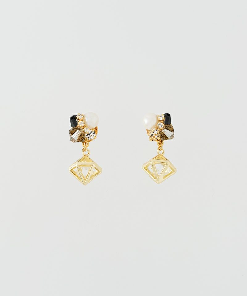 ビジューのきらめきと、シャープなダイヤ型ワイヤーモチーフが耳元で揺れる「カラートーンダイヤ」