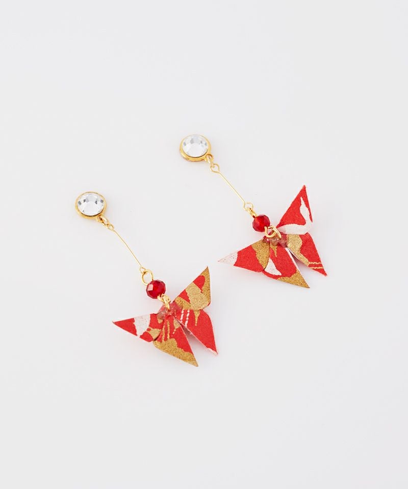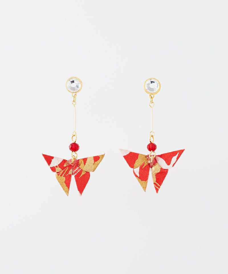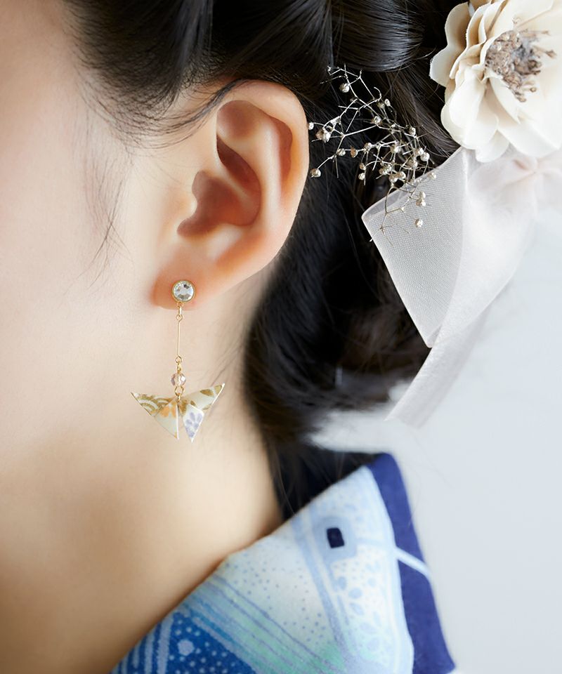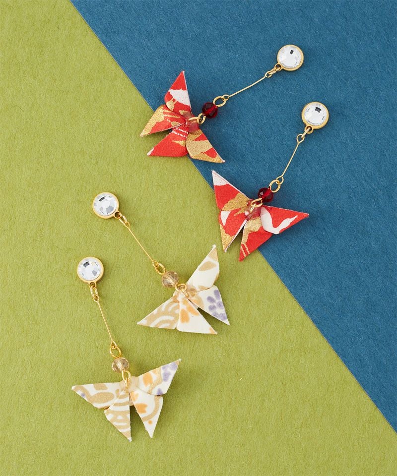 折り紙でかたどられた蝶々が耳元で軽やかに揺れるアイテム。