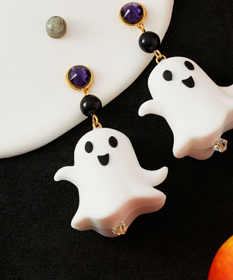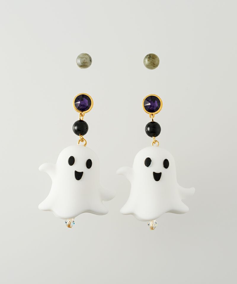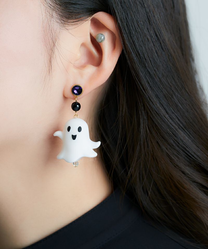 ころんと大きな白いオバケが耳元で揺れる遊び心たっぷりのピアスです♪