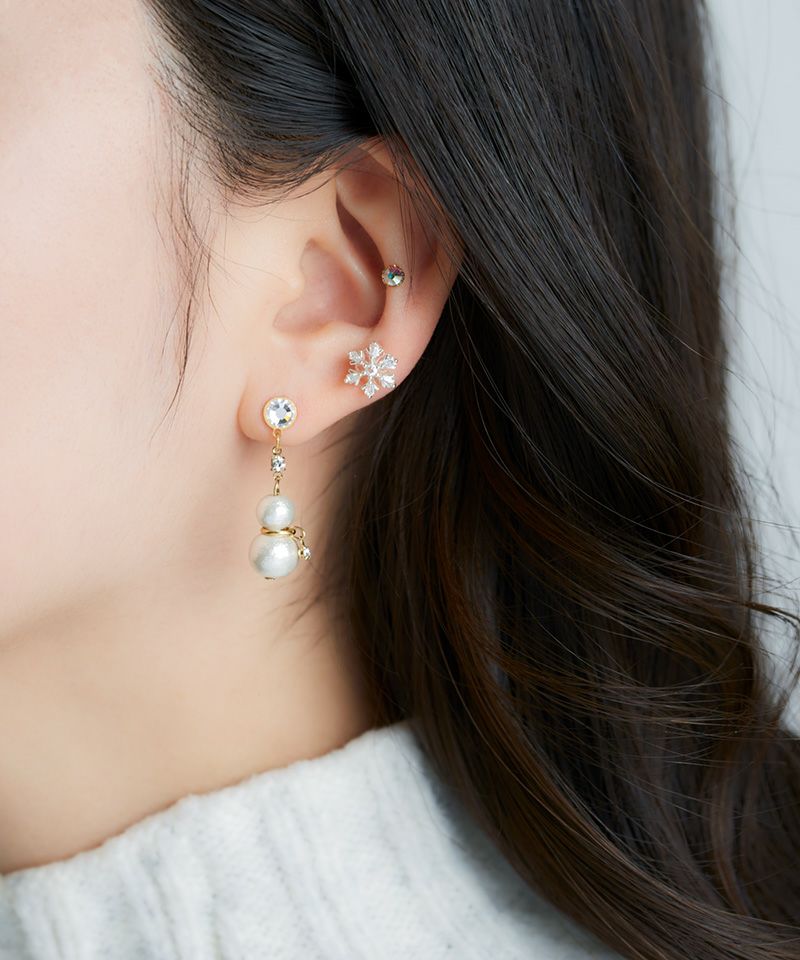 コットンパールの雪だるまチャームと繊細にきらめく雪の結晶ピアスを組み合わせた、冬感満載の3点セット♪