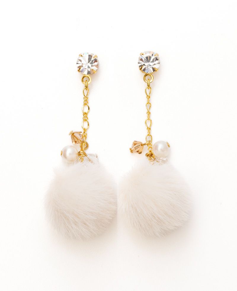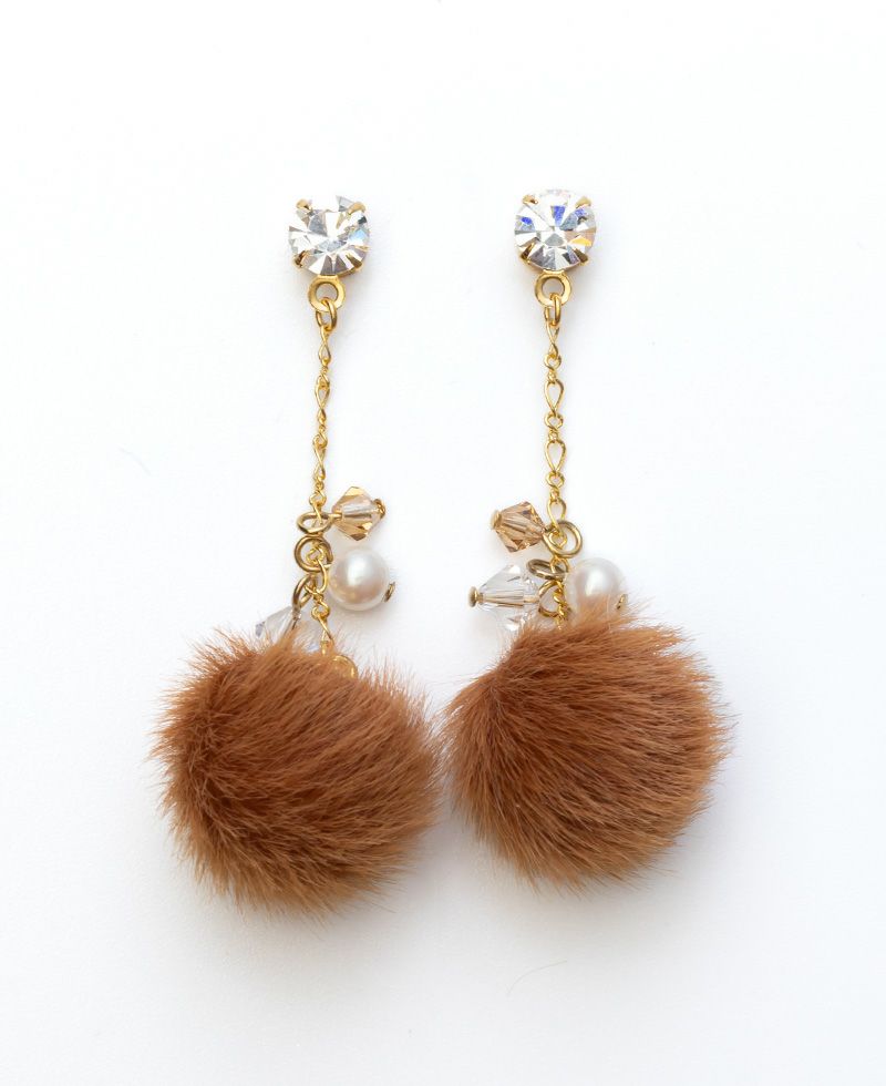 小ぶりなファーがコロンとしていてカワイイ素敵なピアスです♪ 今秋流行カラーのブラウンコーデに活躍してくれそうです♪ 長めのチェーンについているパールビジューが揺れ動く感じもとても華やかです!
