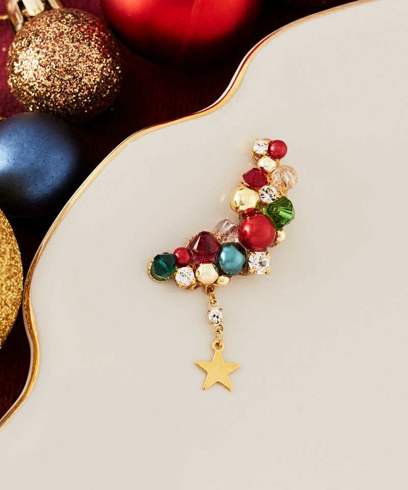 赤と緑を基調にしたビーズとストーンがきらめき、三日月からは小さな星がゆらりと揺れます☆