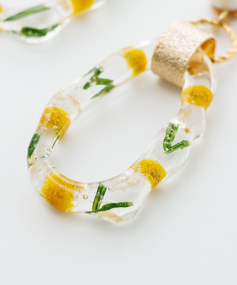ミモザのつまったクリアのニュアンスフープが個性的なアイテム!