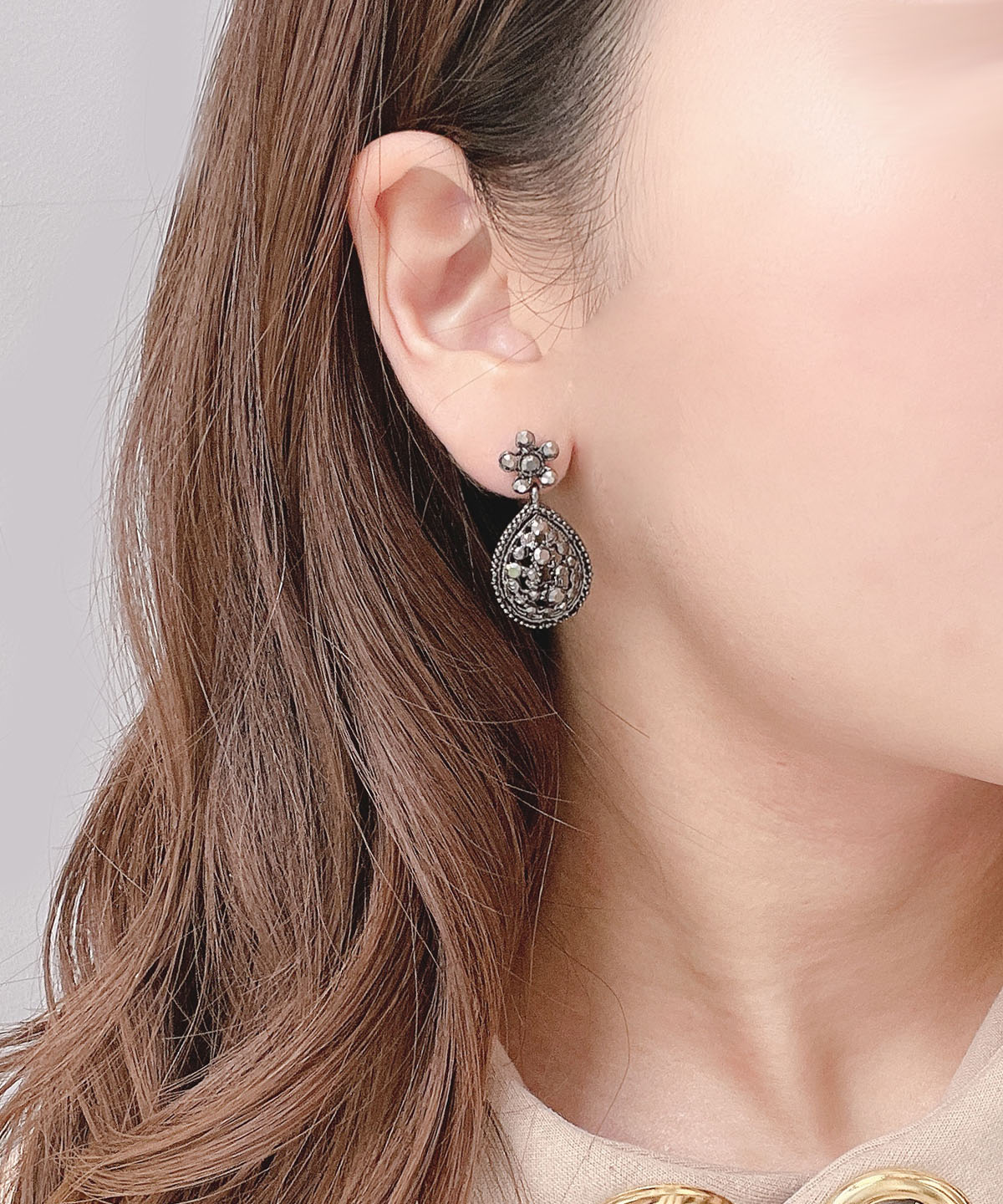 お花とドロップの組み合わせが女性らしいデザインに。ブラックメタルなので可愛くなり過ぎず、大人の女性に是非使っていただきたいアイテムです!揺れに合わせて輝くブラックビーズがお顔をパッと華やかな印象に仕上げてくれます。