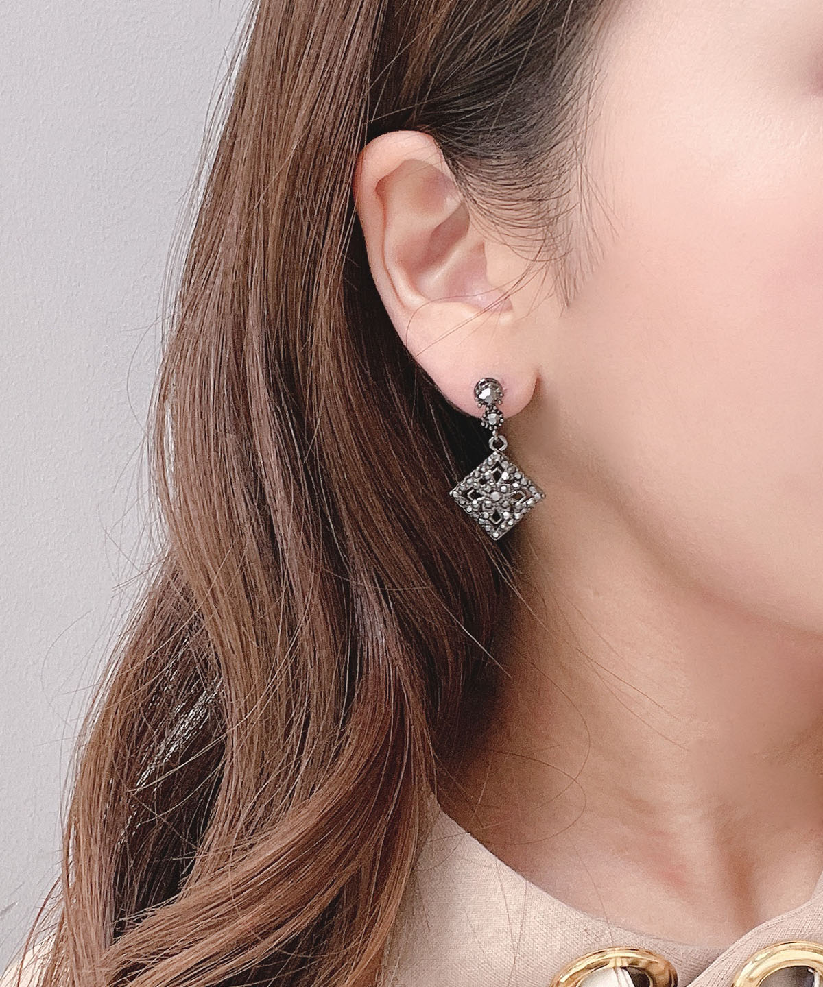刺繍のように埋め込まれたブラックビーズが揺れる度にうっとり輝きます。ランダムに輝くスクエア型のデザインが特徴的なアイテムです。