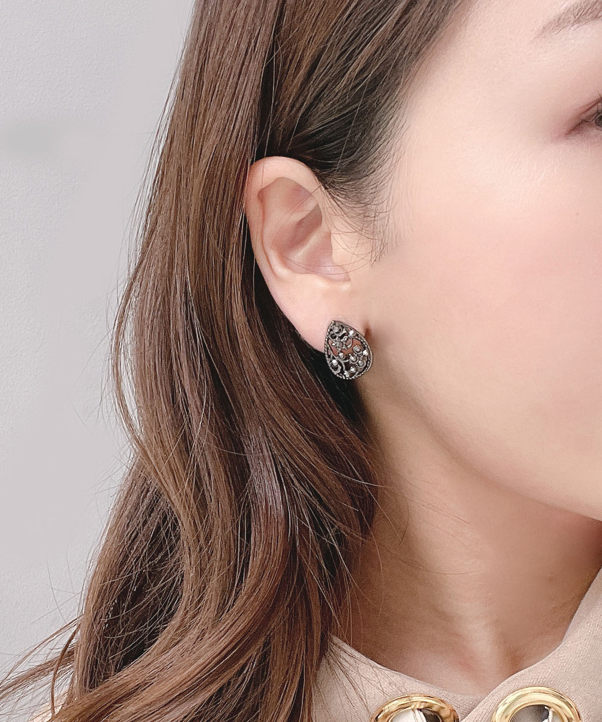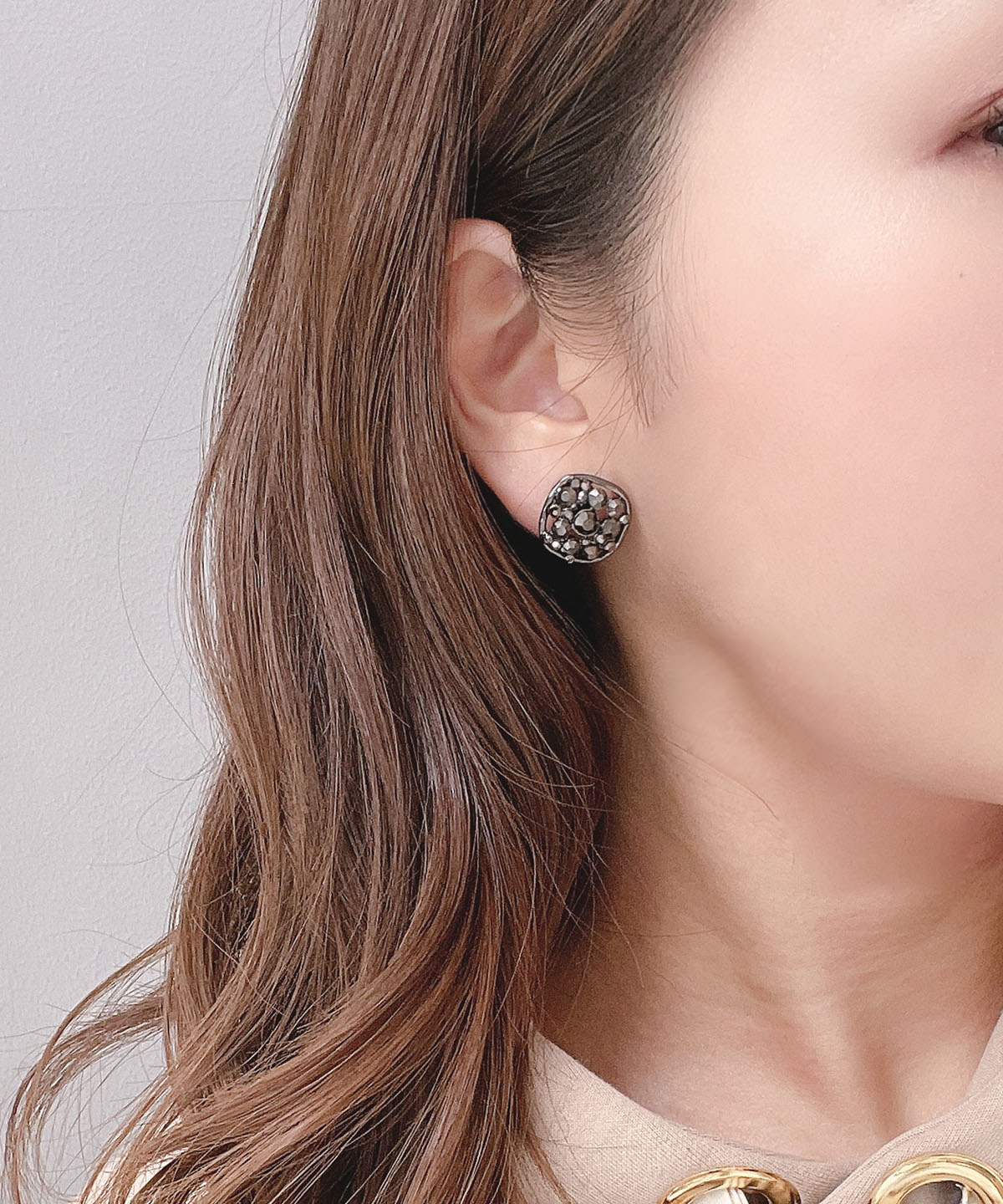 少しウェーブのかかったラウンド型にブラックビーズを埋め込みました。シンプルで付けやすいアイテムに仕上がっています。